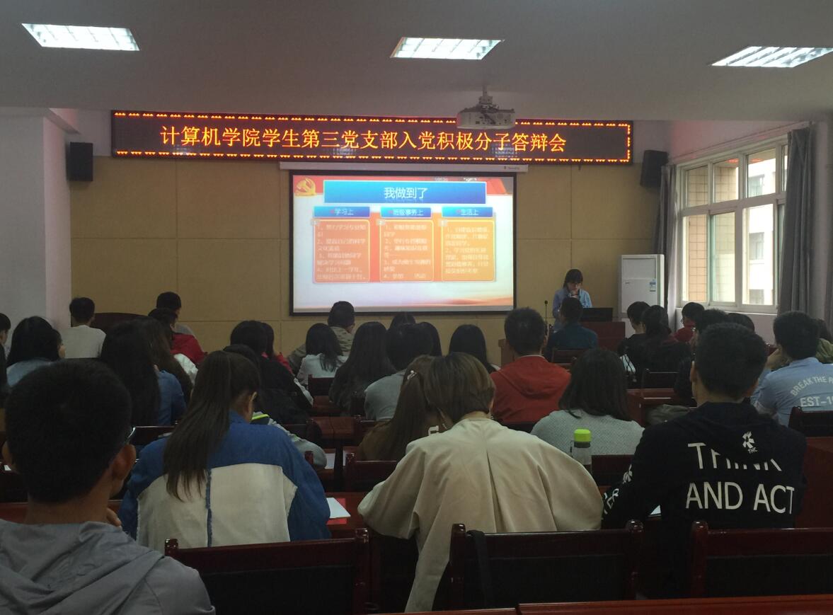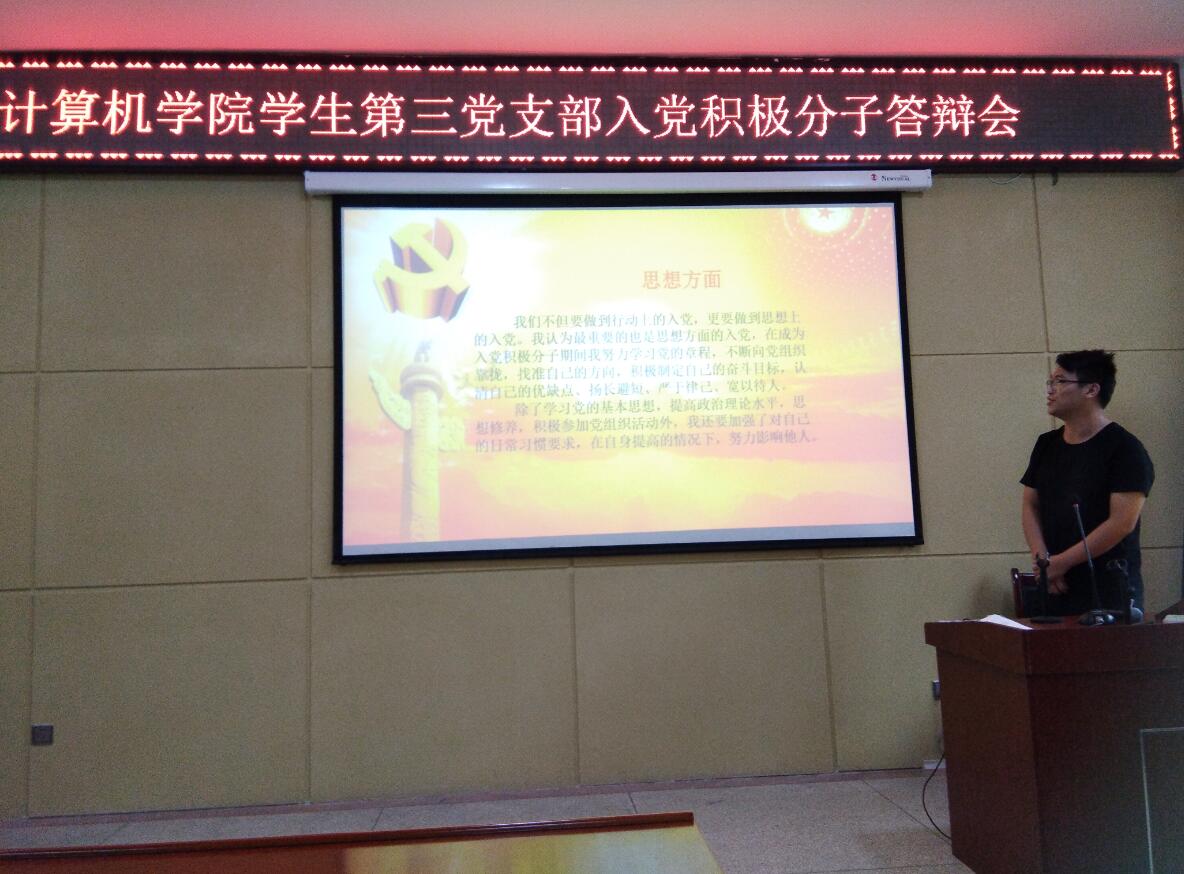 比赛结束后,计算机学院学生第三党支部进行了入党积极分子答辩会,参与答辩的入党积极分子以PPT的形式展示汇报了自己在确定为入党积极分子后的思想、学习、生活情况,由支部书记、学生党员以及学生代表组成的答辩评委从入党动机、志愿服务、个人学习成绩、践行先锋模范作用、缺点及不足等方面提出的问题,并给出了合理化建议,选手们也认真地回答了这些问题,最终本次答辩会在大家热烈的掌声中圆满结束。