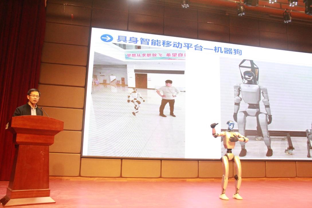 于振华教授在题为《能源大模型:赋能煤炭工业智能化转型的创新引擎》的报告中系统阐述大模型的起源与发展趋势,重点展示了我校自主开发的能源领域大模型在教育教学和科学研究中的创新应用。在具身智能平台展示环节,详细介绍了机器狗在复杂井下环境实现自主巡检所涉及的环境感知、路径规划与动态避障等核心技术,同时也展示了人形机器人的一些创新应用。尤为引人注目的是,这些前沿技术的研究与开发过程中,均有学院本科生作为重要力量参与其中,充分展现了学院在科研反哺教学方面的扎实成效。