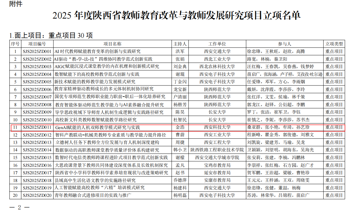 近日,陕西省教育厅公布了2025年度陕西省教师教育与教师发展研究项目评审结果。我院金浩教授主持申报的《GenAI赋能的人机双师教学模式研究与实践》获批重点项目立项。