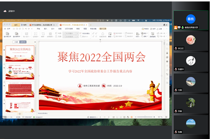3月11日上午,软件工程系通过腾讯会议形式召开了 “聚焦全国两会,学习与分享”的主题会议,软件工程系全体党员和软件工程系全体教职工参加了本次会议,会议由软件工程系党支部书记秦昳老师主持。