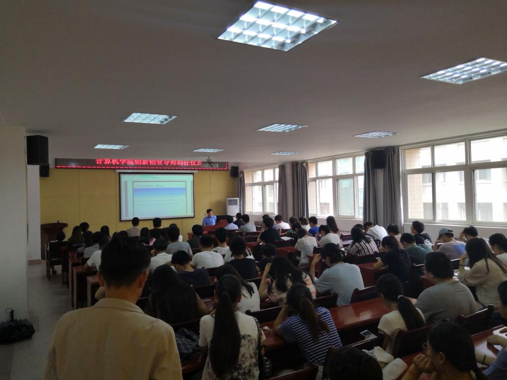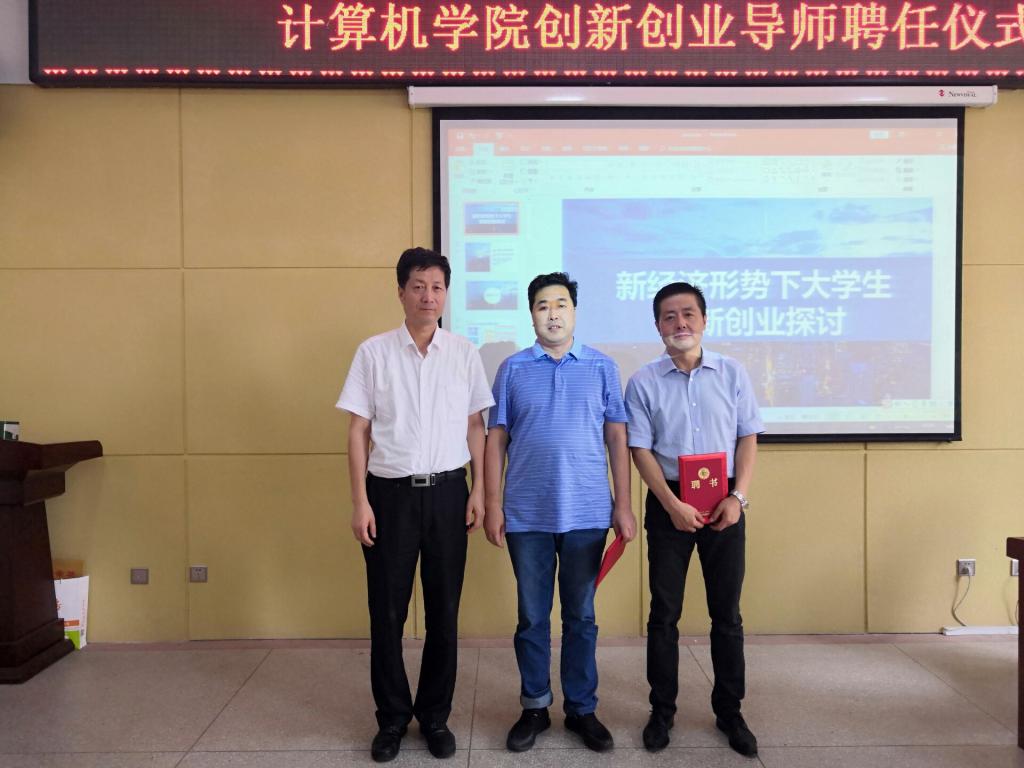 首先,李占利代表学院对受邀担任计算机学院大学生创新创业导师杨军闫永军颁发了聘书。然后,杨军了《国家战略与个人发展》的报告,闫永军了《新经济形式下大学生创新创业探讨》的报告。最后导师们分别学生们提出的相关问题一一作了解答。