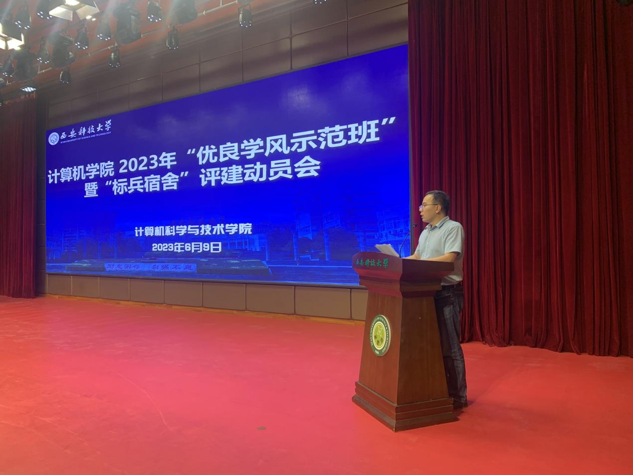 6月9日,计算机学院在临潼校区骊山校园煤炭科技楼一楼报告厅召开2023年“优良学风示范班”暨“标兵宿舍”评建动员会。学院党委书记李绥波、副院长金浩、教师代表、全体学工干部,各年级班长、团支书,一至三年级全体学生宿舍舍长,2022级全体学生参加了本次会议,会议由学院党委副书记郭胜忠主持。