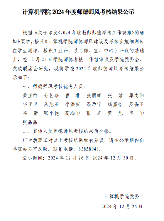 计算机学院2024年度师德师风考核结果公示